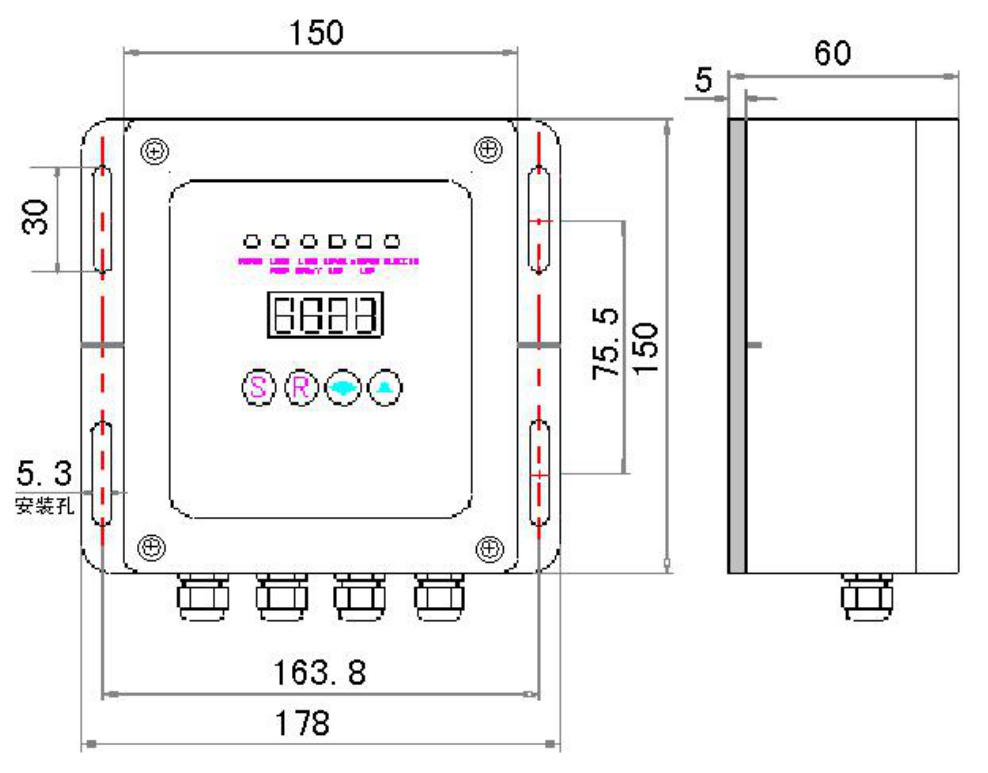 面板顯示窗口有四位數(shù)碼管,用于顯示系統(tǒng)工作狀態(tài)和編程。六個指示燈分別為:電源;油路