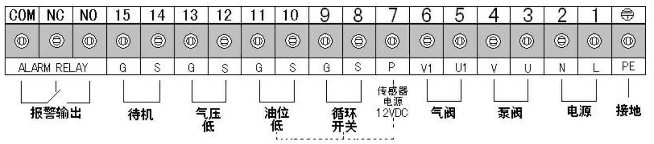 端子 12、13 接低氣壓信號檢測開關(guān)(此開關(guān)閉合控制器報警)。
