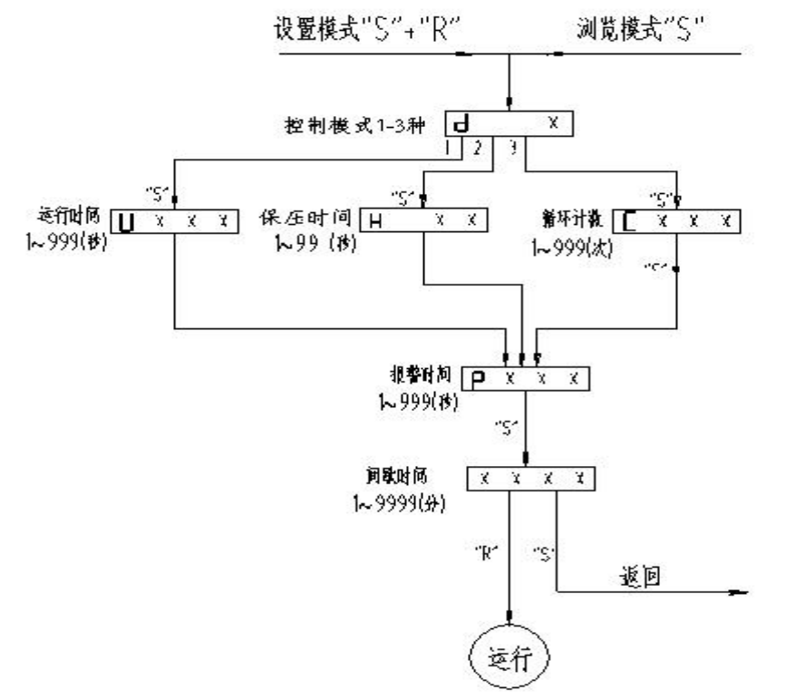 控制器處于任何狀態(tài)下按動“S”鍵即可瀏覽已存貯的各項(xiàng)參數(shù),不影響當(dāng)時狀態(tài)。停止按鍵片刻即自動返回。